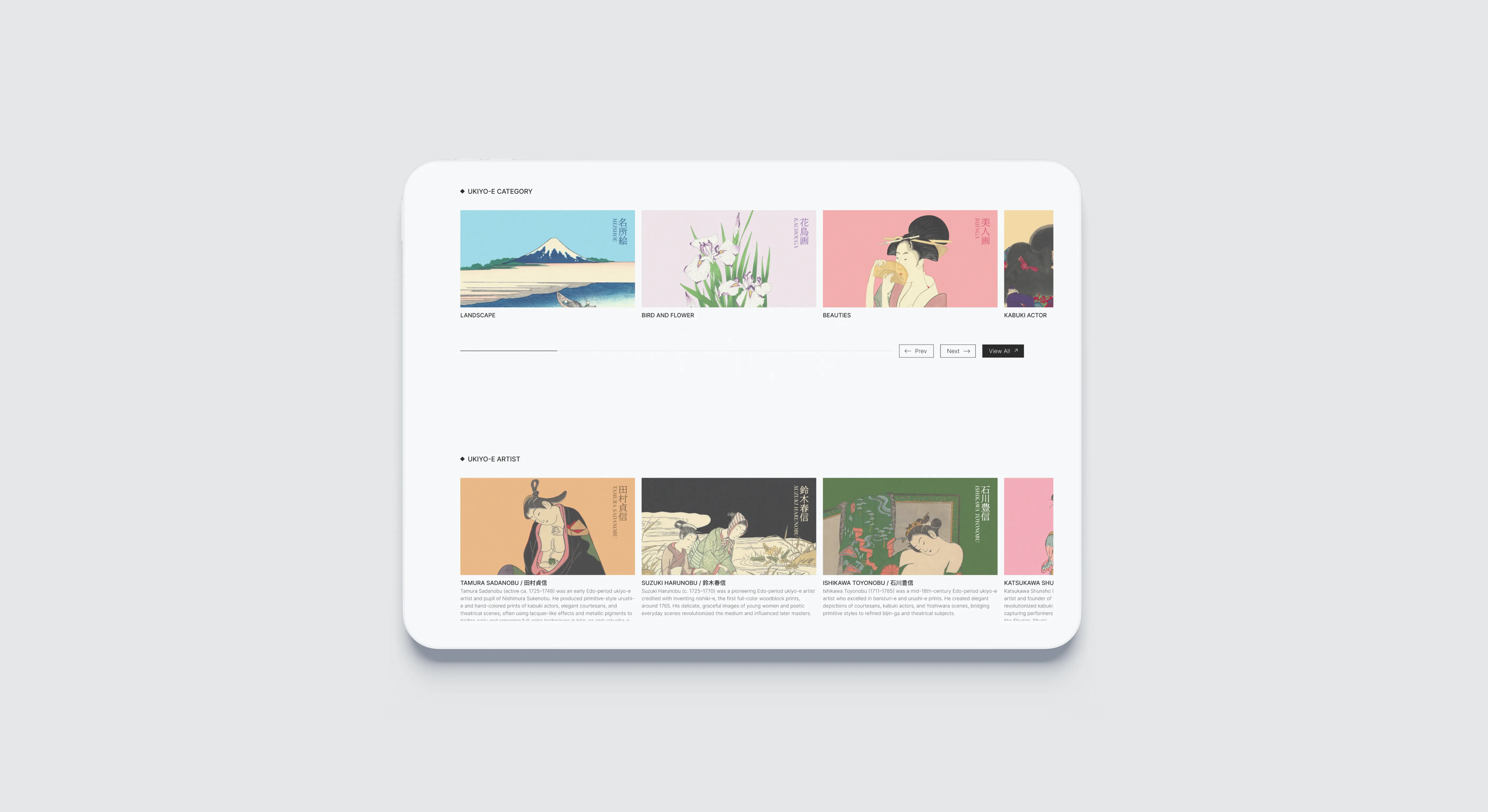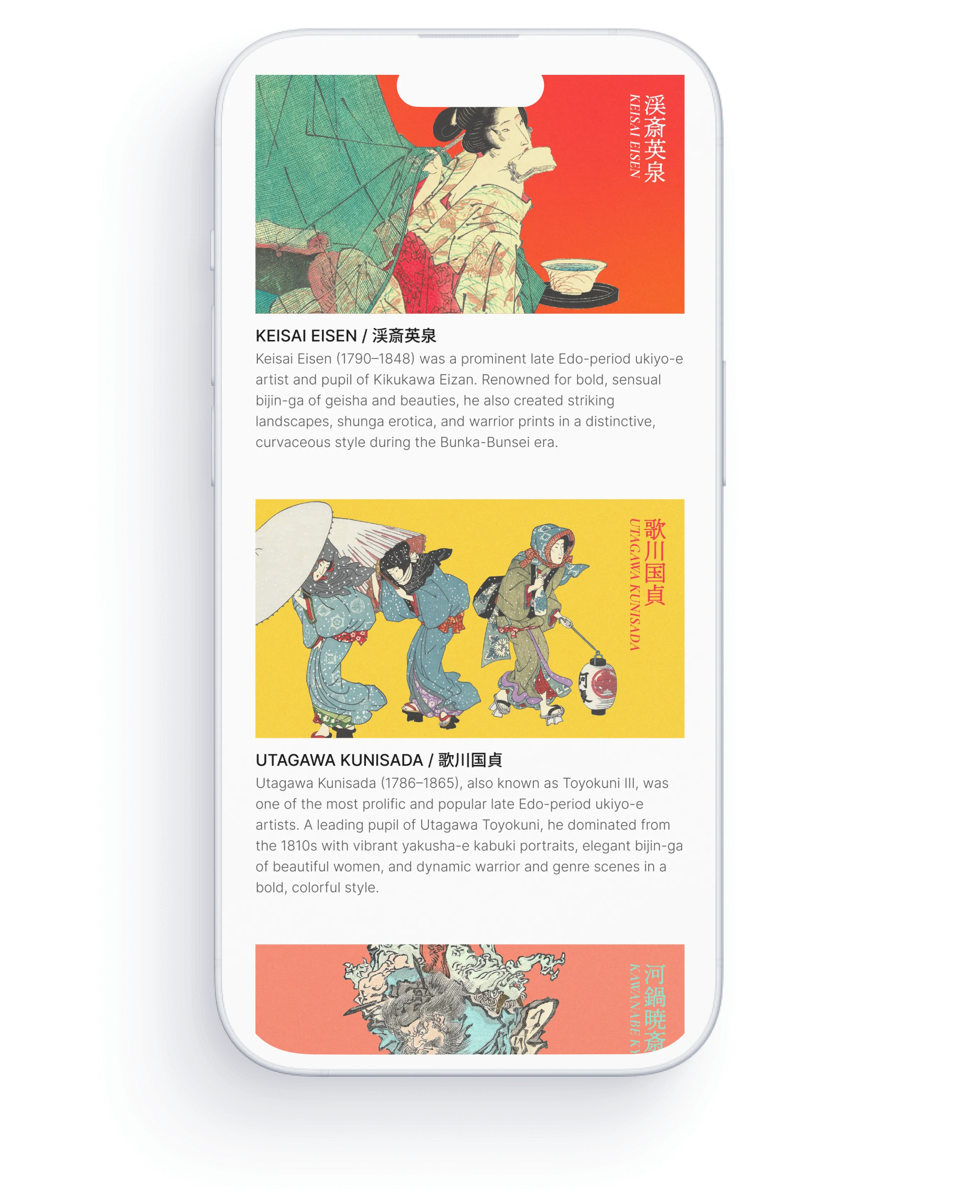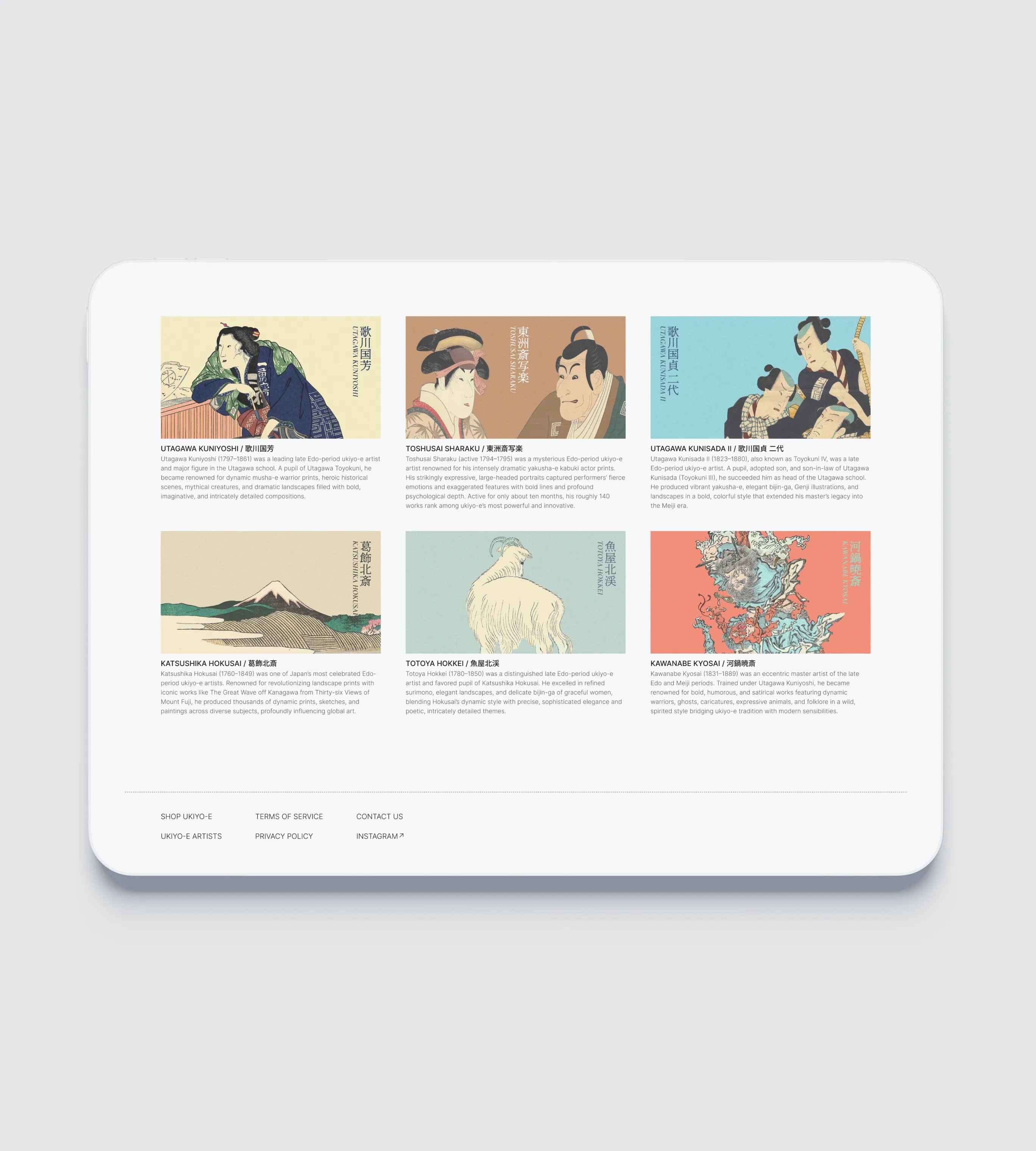 This page showcases all the various categories of ukiyo-e, along with an introduction to the featured ukiyo-e artists and their unique styles.